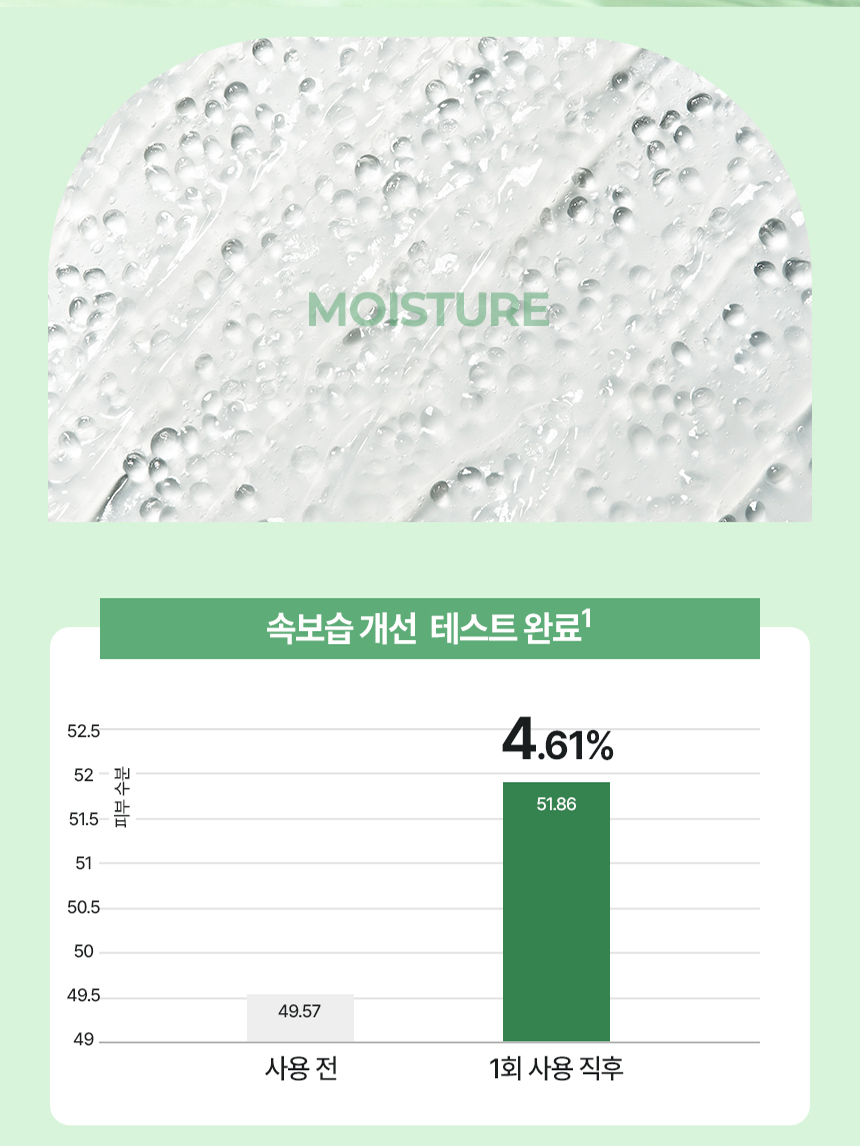 속수분, 예민피부 진정, 피부결 개선, 피지 조절 등의 테스트를 진행해서 모두 100% 개선 효과가