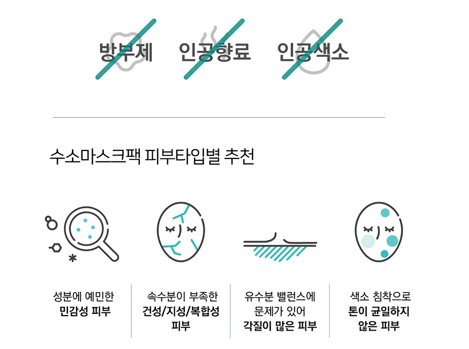 수소 마스크팩은 성분에 예민한 민감성 피부, 수분이 부족한 건성, 지성, 복합성 피부, 유수분 밸런스가 맞지 않아 각질이 많은 피부, 색소 침착으로 인해 톤이 균일하지 않고 칙칙해진 피부 등